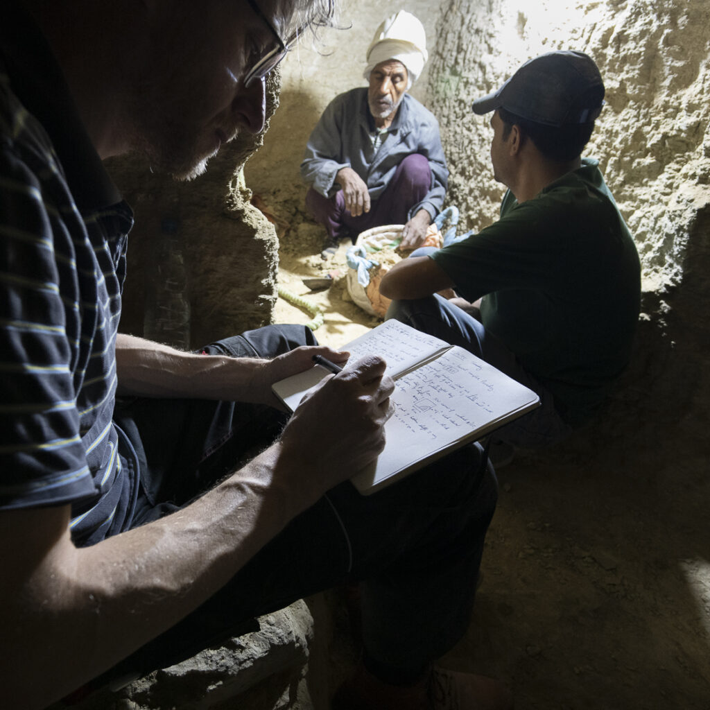 [Figura 2: Nico Staring a sinistra documenta il pozzo con l’aiuto di Walid Khaled (a destra) e Mustafa Said Mohammed (sul fondo della foto). Foto: Nicola Dell’Aquila.]