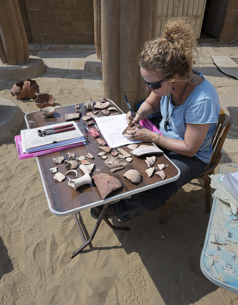Lo scavo procede in modo stratigrafico: negli strati superficiali incontriamo tracce della nostra epoca o di poco precedenti. Pensate, abbiamo persino ritrovato vecchie pagine di giornale con la data stampata sopra! Solo scendendo sempre più in profondità riusciremo ad arrivare al periodo storico a cui appartiene la tomba di Panehsy: il Nuovo Regno (1539-1077 a.C.). È un processo lungo e certosino, bisogna registrare ogni informazione possibile. Strato dopo strato, tra la sabbia cominciano ad affiorare piccoli frammenti di ceramica: orli, anse, fondi, pareti. Sono i primi segnali che il sito è pronto a restituirci le sue storie.