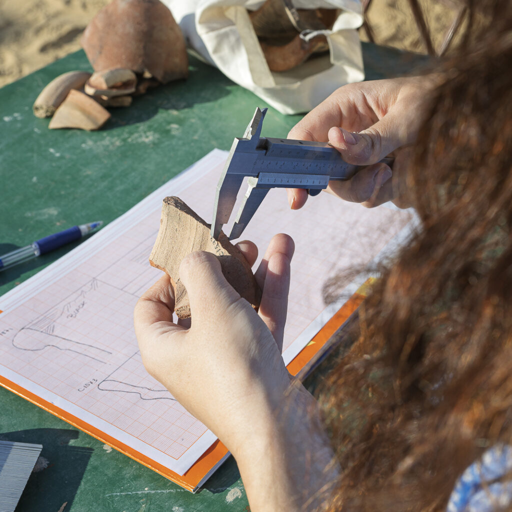Con gesti ormai automatici, si separano i pezzi di pareti da quelli diagnostici (ovvero orli, anse, fondi – è da questi frammenti che si può ricostruire la forma intera di un vaso), si riconoscono gli impasti, si cercano frammenti che attaccano tra loro e si annotano le prime impressioni. Segue la schedatura per i frammenti particolarmente parlanti di cui si esegue anche il disegno. Il disegno ceramico è una fase fondamentale del lavoro archeologico, perché permette di restituire in modo preciso e leggibile la forma originaria dei frammenti e dei vasi. Attraverso il disegno, ogni dettaglio – come lo spessore delle pareti, la curvatura di un orlo o la decorazione – viene rappresentato in scala e con un linguaggio grafico standardizzato, così da poter essere confrontato con altri reperti.