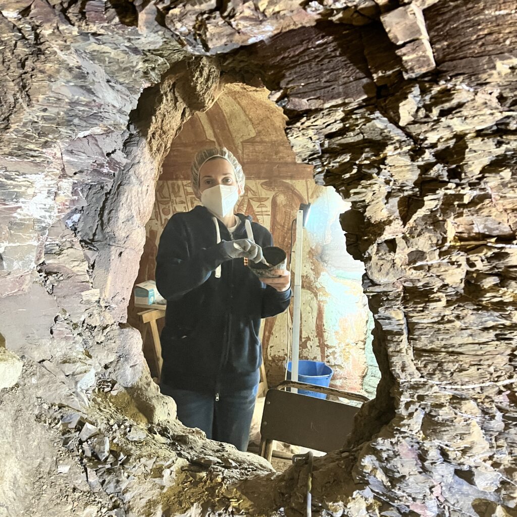 Continua il nostro lavoro nella tomba di Khaui, nota con la sigla TT214, nello specifico nella camera funeraria decorata. Questa è caratterizzata da dipinti murali oggi fortemente compromessi da una storia lunga e complessa. Qui opera una squadra composta da egittologi e conservatori del museo, affiancati da un team del CCR La Venaria Reale. A coordinare le attività è Michela Cardinali, direttrice dei laboratori del CCR, insieme alle restauratrici Marie-Claire Canepa e Roberta Coco.
