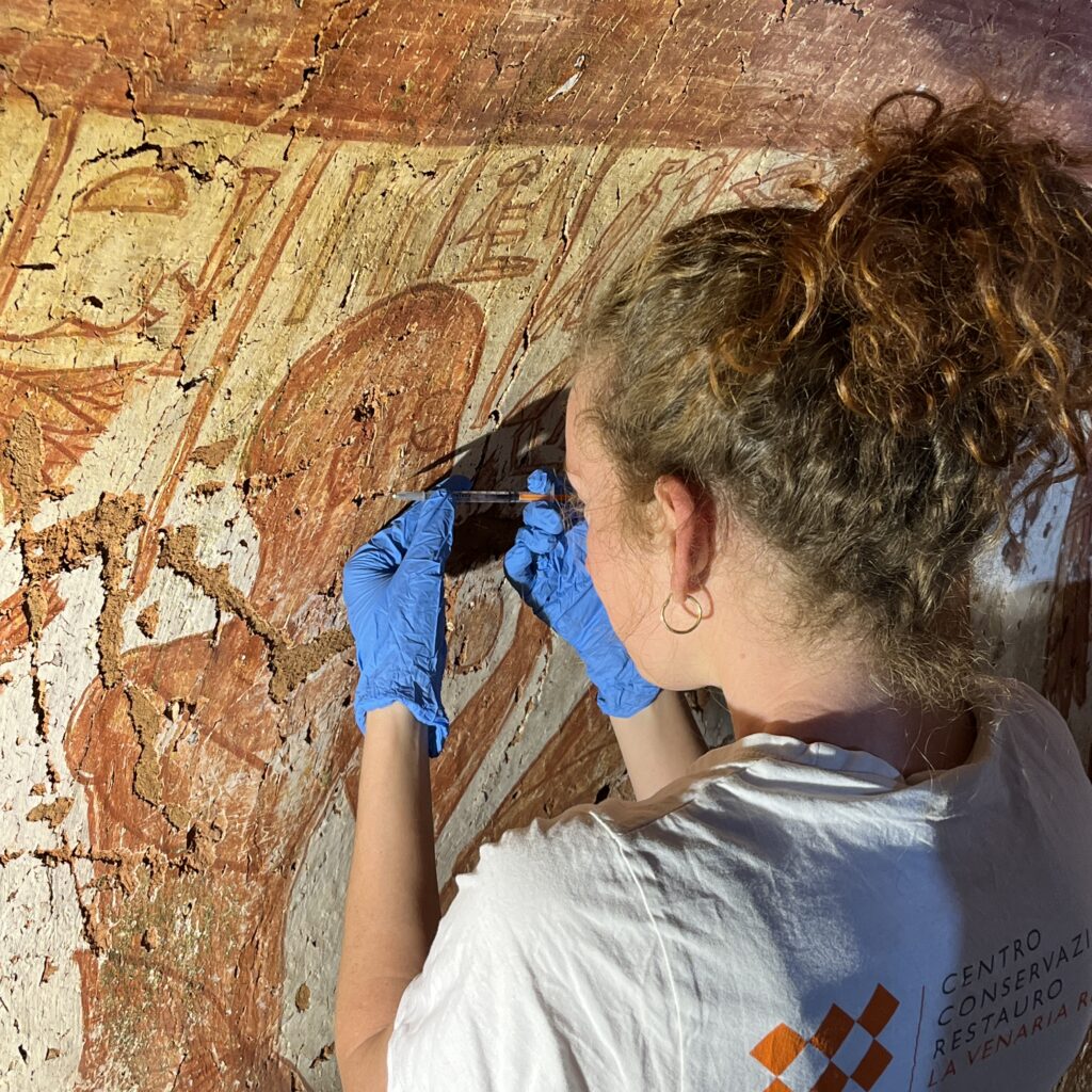I lavori di restauro sono stati avviati nel 2024 con una prima fase di studio, documentazione e di messa in sicurezza, indispensabile per comprendere la natura dei materiali e prevenire ulteriori perdite. Queste attività hanno permesso di approfondire la tecnica esecutiva, lo stato di conservazione dei dipinti e di ricostruire i principali eventi storici e conservativi. Quest’anno si procede invece con interventi di consolidamento degli intonaci e stuccatura che termineranno con l’avvio della reintegrazione pittorica che migliorerà la comprensione delle scene dipinte.